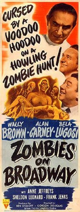 Zombies On Broadway ( 1945 ). This film was never released theatrically in Australia. This film came from the major studio RKO Radio Pictures and normally all their product would have been released here. The only reason it would appear that it didn't reach our shores is that it was banned here due to the horror content, although no record can be located to confirm this.