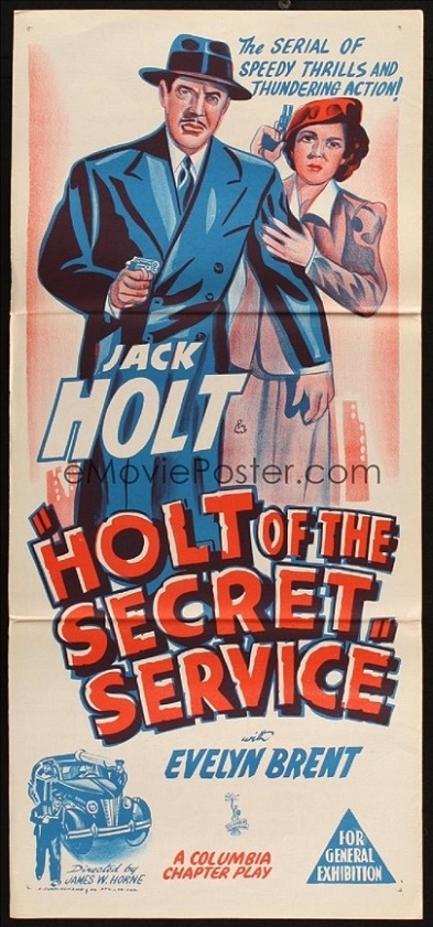 This Holt Of The Secret Service ( 1941 ) daybill is often referred to and sold as an original but it is from a printing done at a much later date. It is most likely post 1953. I was able to see the original last year and can report it is the same in design and colour except the original has the printer shown as W.E. Smith and the Columbia Pictures logo is the one I included above.