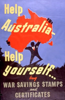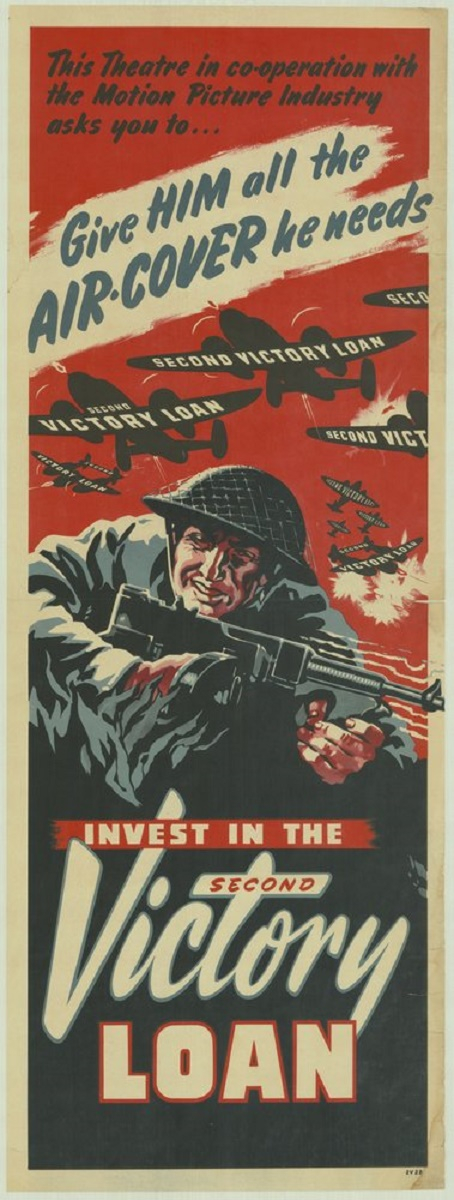 An Australian, appearing to be a larger than usual sized daybill poster, that was designed for displaying in cinemas in Australia during World War 11 to promote the Second Victory Loan.