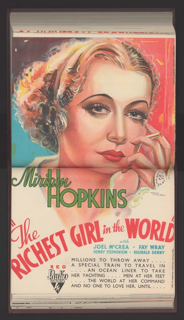 A late entry of a trade advertisement from Everyones magazine dated November 14, 1934 featuring McMurray's outstanding artwork image of Miriam Hopkins promoting RKO's The Richest Girl In The World.