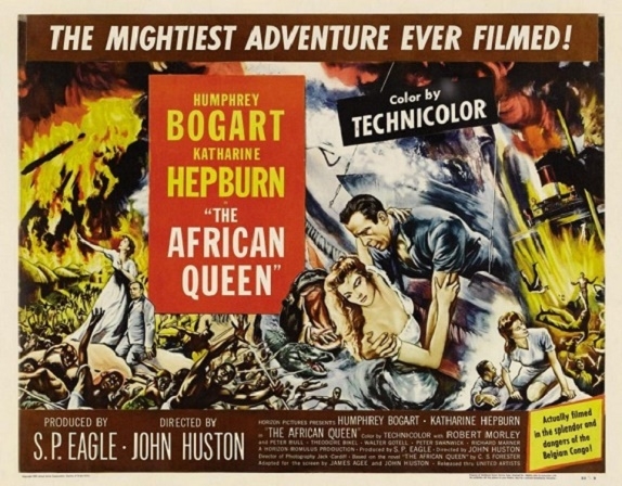 • The African Queen  ( 1951 ) U.S.A. 1/2 sheet. A great action filled poster that does exaggerate the contents of the film somewhat. It does however highlight the two stars of the film Bogart and Hepburn.