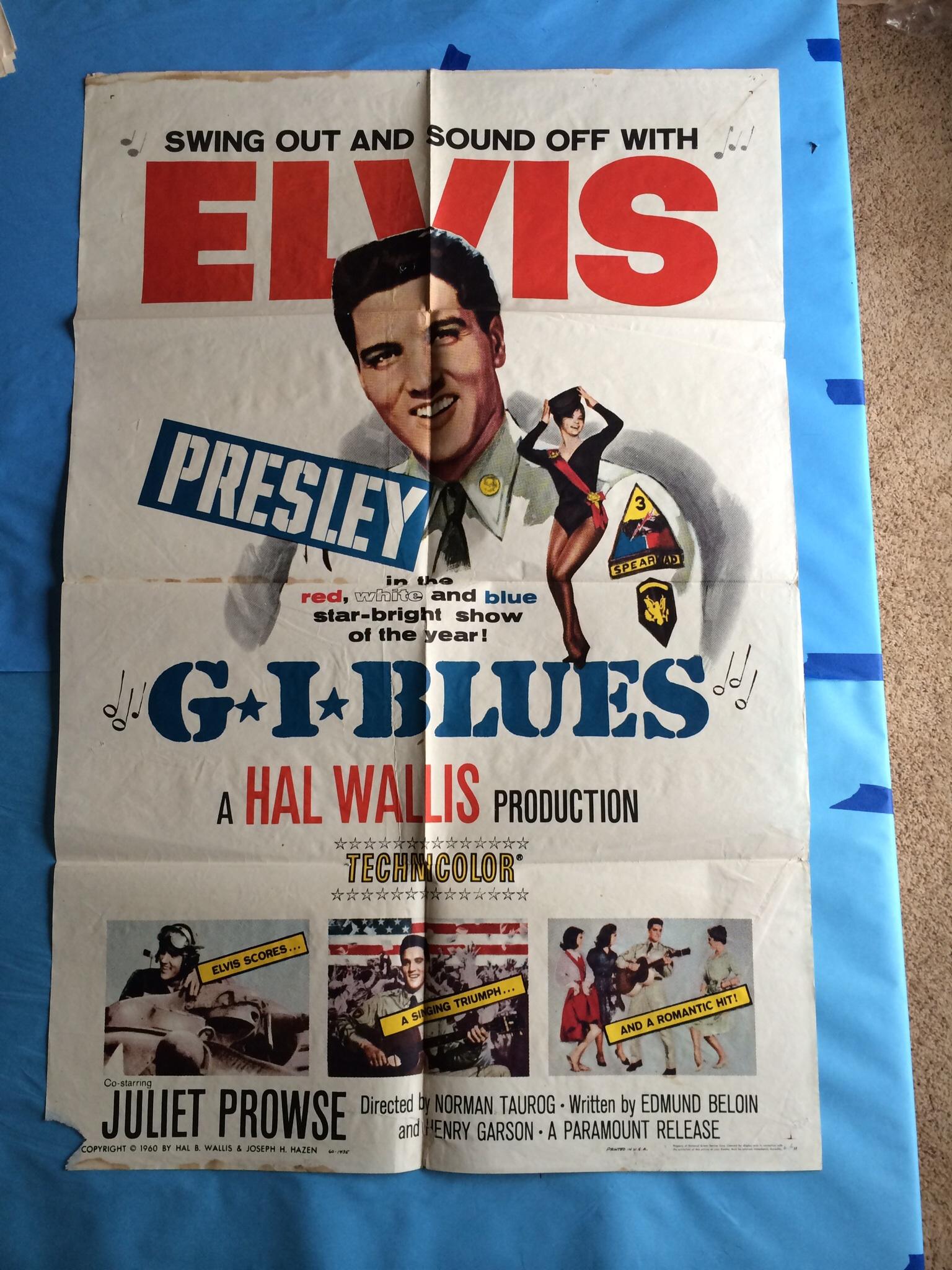Couple of Elvis one sheets. Effects of moisture/poor folding/a few water stains/some paper loss. Perfect candidates for future conservation & support.