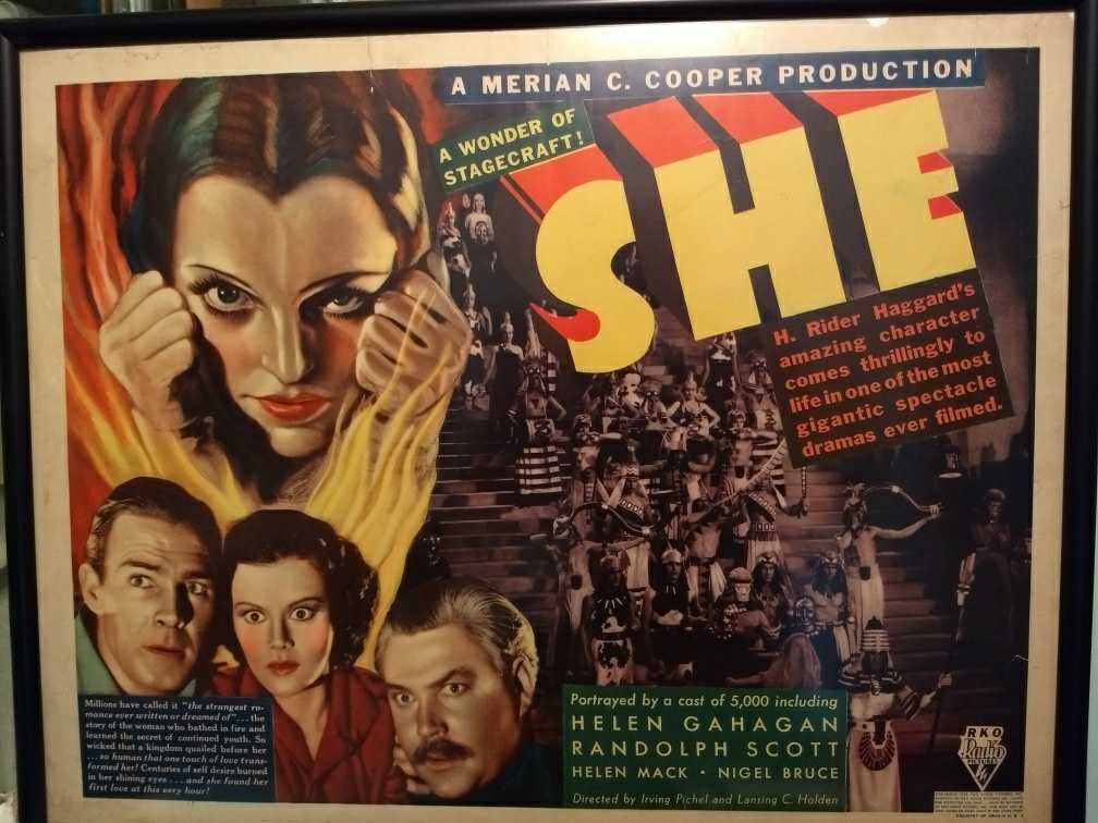 Thanks, Hondo! Here's one more contender for tonight (in North America): She 1935 original half sheet. It's framed, so sorry about the bit of a glare. I suspect some of you have seen this one before as it has sold a couple of times over the last 20 years until I bought it a few years back. I think it looks just fine in its original state and chose to leave it untouched. I also just bought a beautiful exhibiter book cover for She via Morrie that I'll show in the September 2021 thread. I think some of the posters for this movie are so lovely. Best, Okie