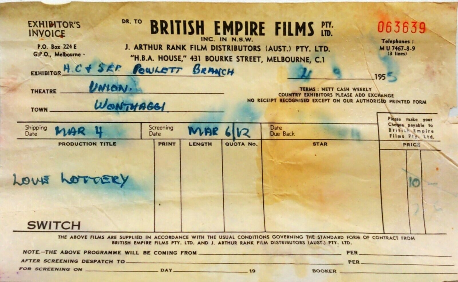 Regarding the three Union Theatre invoices they would all be 35mm.  The Wonthaggi Union Theatre, according to The Film Weekly Motion Picture  Directory1961-62  yearbook lists the 945 seater theatre as a 35mm venue.