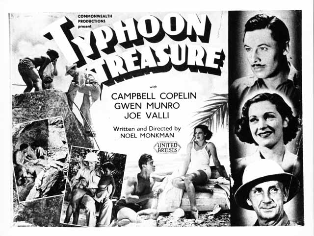 # 1.Typhoon Treasure ( 1938 ). First of a series of rare Australian printed posters of films that were made in Australia. A daybill of unknown length. Note no blank white section at the top of the poster. I am sure the poster is from the original and only release in Australia in 1938 and the top of the poster has been trimmed. Only image I have ever seen of this title.