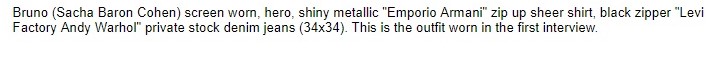 Every now and again, I am known to buy props that were (supposedly) used in movies. This time, I (supposedly) have some screen-worn costumes in the mix. As I was flipping through the offerings for a recent auction, I came across the shirt (the next item down) I instantly recognized as having seen, worn by an extra, in the film "BRUNO". I thought about getting it, but taken out of context, it might be offensive (well, it IS offensive...but meant to be as part of the parodoxic comedy of the film). I thought, if I get that shirt, I should get something that Bruno wore as well. I didn't have time to track the flick down and I've only seen it once in the theater (It wasn't nearly as good as BORAT). This was said to have been worn by Bruno during the first interview in the film. Since winning it, I can find NO EVIDENCE of that. Ha! Oh well... Maybe it was in Bruno, or maybe I just bought a silly hip outfit I will never wear?