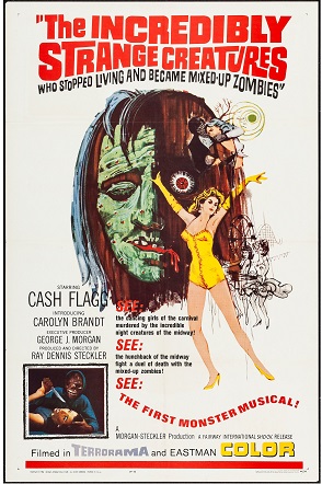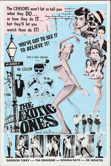 SCORE!!!! I have wanted this poster forever. I'd have preferred to get this under it's alternative name, THE MONSTER AND THE STRIPPER, but I will take what I can get. This shot in New Orleans exploitationer was made by Ron & June Ormond. The Ormonds got their start making westerns. When TV started eating in to the profits of westerns, they switched to horror and exploitation, creating such flicks as MESA OF LOST WOMEN and UNTAMED MISTRESS. From exploitation, they moved into producing country music movies (like FORTY ACRE FEUD and WHITE LIGHTNING ROAD) and then segued into producing roller derby on TV. After a brief return to exploitation (like this flick, THE EXOTIC ONES, and THE GIRL FROM TOBACCO ROAD), their final calling turned out to be making religious scare films, such as THE BURNING HELL and THE GRIM REAPER. This flick features the Ormond's son Tim and stars (as the monster) someone named SLEEPY LABEEF. I kid you not. Zowie!