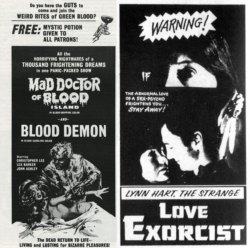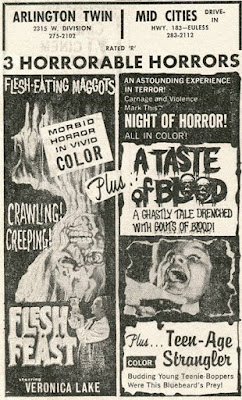 Do you have guts? Can you take 15,000 terrifying seconds of horror in one show! Ha! I may have this poster already---I'm not sure. But just in case, I couldn't let this triple feature re-release poster go. It's just too cool! Apparently this re-release featured green-tinted (or perhaps just a green filter put on the projector?) film as it is "presented in GRUESOME GREEN"! AWESOME!!!