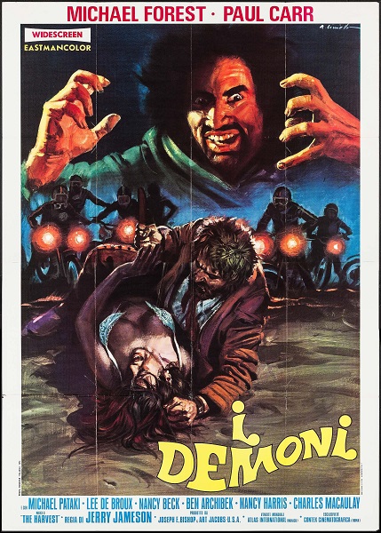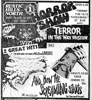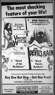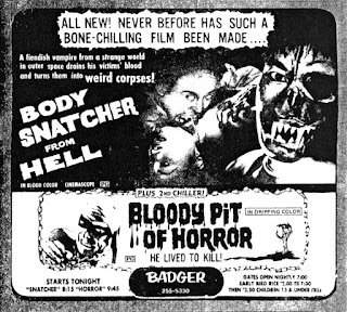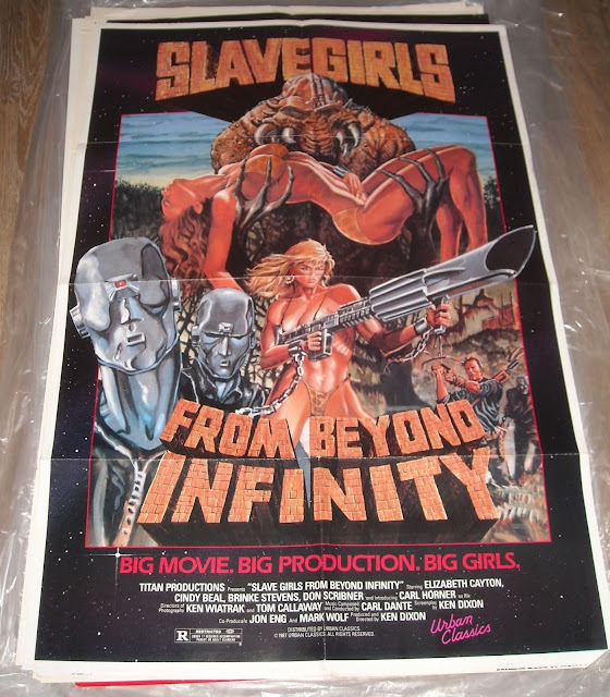 I think I already have a copy of this, but am not sure. I remember actually seeing this with something called CREEPAZOIDS many years ago (late 1980s). The movies were NOT memorable at all--but the experience was. The theater where this was shown was downtown and had, just a few days/weeks earlier, been a Pussycat Theater showing porn! Ha! This new theater (I think it was called The Lyric Theater?) apparently did ZERO renovations, as the place screamed porn theater when I was inside. Red velvety curtains along the walls, red seats, red-painted walls in the lobby. Even the outside marquees still had the Pussycat Theater logo on them. It was weird being in a "porn theater" watching "regular" movies. After seeing the flicks, I kept my eye out for other obscure stuff to play there I'd like to see (SLAVEGIRLS and CREEPAZOIDS played nowhere else in town). Alas, almost as soon as it opened, the Lyric closed. I don't think it was even open a month. I never got back to it and it has been shuttered ever since. The movies may have been forgettable, but the poster art on this one is cheesy cool.