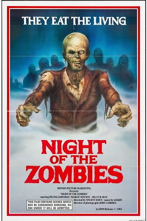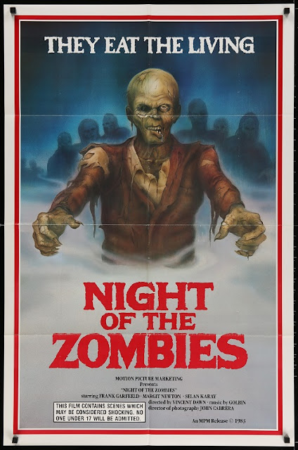 This crap-o-rama Italian film by Bruno Mattei is better known today as HELL OF THE LIVING DEAD on DVD and BLU RAY, However, it was released here in early 1984 as NIGHT OF THE ZOMBIES. Cool poster art, but stupid movie. Of COURSE I have it. Ha! I got another copy of this poster not long back...but for whatever reason, I went for it AGAIN. I'm a sucker for zombies... When this (and other unrated flicks) came out with the self-imposed "No One Under 17 Admitted" (which, I think, started with DAWN OF THE DEAD) fortunately my local theaters viewed this as meaning they were rated R. Although I was of age when NIGHT OF THE ZOMBIES came out, with others (such as DAWN...), I had to either have my grandmother (!!!) take me or try to pass for being 17. I don't think I was ever turned away. Ha!