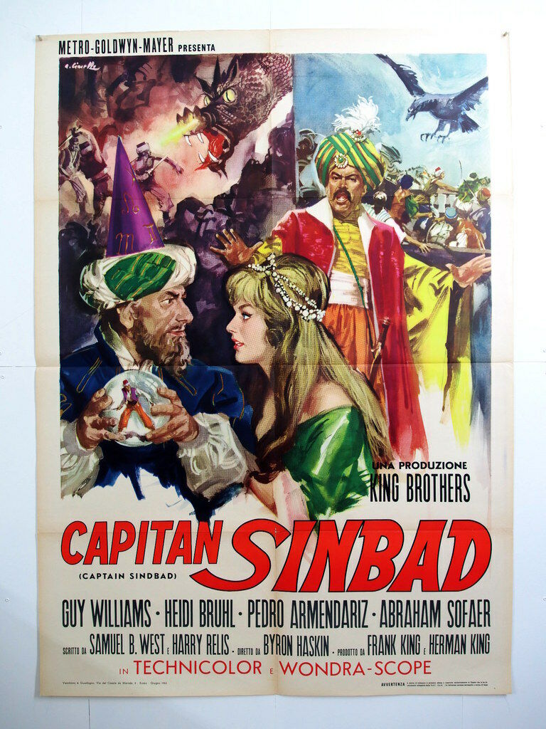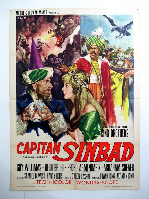 I am really delighted with this little find. Italian posters were (past tense...since everyone does quick/cheap Photoshop stuff these days) so wonderfully painted back in the day. I've got a collection of Sinbad movies, including the US release of this film. However, for some reason, the US poster calls the film "CAPTAIN SINDBAD" and that extra "D" just bugs the crap out of me. I don't know why they did it. ALL of the cinematic Sinbads I've tracked down have always used the single "D" spelling. My only guess is they were trying to avoid any copyright infringement from "THE SEVENTH VOYAGE OF SINBAD" at the time? Who knows... Who cares...? I'm just glad to have this. Yippie!