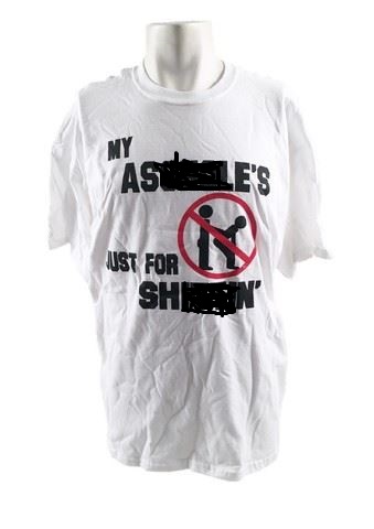 When I saw this T-shirt for auction, I immediately flashed on seeing it, worn by an extra, in the film BRUNO. From what I read/heard, much of BRUNO (like BORAT) is improvised in front of unwitting people---kind of like a "Candid Camera" thing. To get better reactions from the unsuspecting, extras were used and costumed accordingly and fit in to the scenes. I always thought this shirt was just too much for anyone to really wear in public. Apparently, I was right. This was a costume worn by a planted extra. The photo has been censored...but I think you can figure it out.