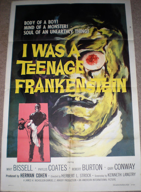 I have long wanted one of these (and its companions I WAS A TEENAGE WEREWOLF and HOW TO MAKE A MONSTER). This one has been on eBay forever...and I've been watching it just as long. The price has dropped little by little with no takers. Why? The word "Frankenstein" is on the fold line and the paper has torn through somewhat on the "A" and "N"...so it has some minor issues. it could be linenbacked, but I think it will be okay simply framed. You really can't tell that easily. I'm pleased with it...I think.
