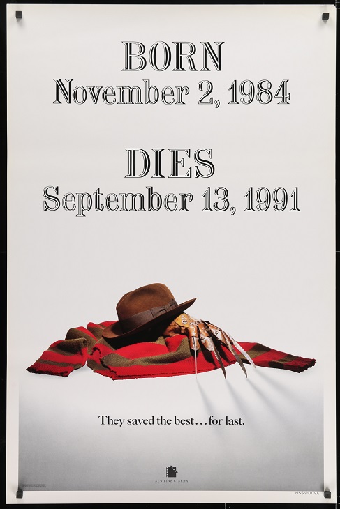 I probably already have this--I know I have the regular one sheet--but was not sure about this advance. Hmm. So I got it. This sixth was NOT the end of the series (Duh!)---and it was kind anti-climactic anyway. The 3-D finale was a great gimmick I would have rushed out to see---had I not already planned on seeing this (I'd seen all of the ELM STREET flicks in the theater to that point). The finale was STUPID (despite the 3D). Oh well. Freddy is an amazing character---and trying to explain why he is the way he is was not necessarily a good idea. The following entry, "Wes Craven's New Nightmare", would be the last in the series....and that was followed by a lackluster remake of the original (the only one I didn't bother seeing in the theaters).
