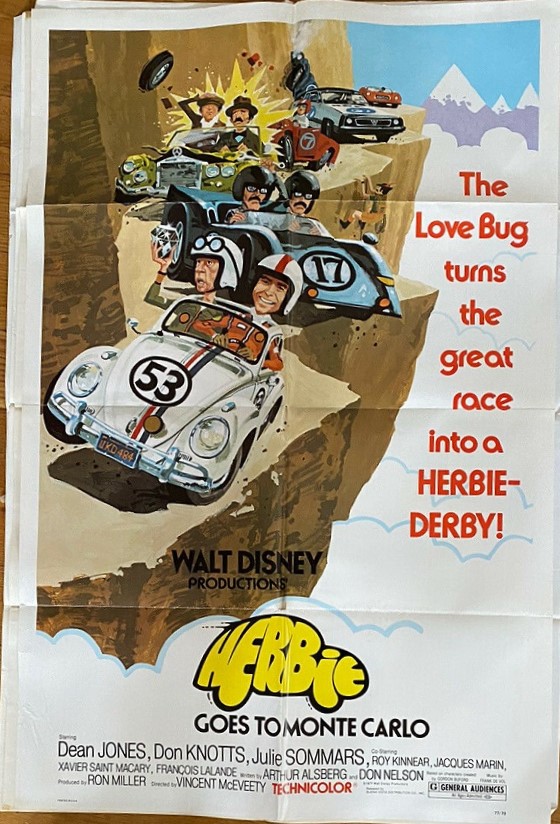 Okay... My strange and unexpected quest to track down all of the Herbie the Love Bug posters has come to a close with this poster (Unless--God forbid--I decide to go after the remake/reboot/sequel HERBIE FULLY LOADED). Except for the first two movies in the series (THE LOVE BUG and HERBIE RIDES AGAIN--in their initial releases when I was a kid), I've not seen any of the Herbie films (or the TV movie remake, or the TV series). The hunt for the posters started as a fluke and I'm just glad it is done (unless I go for the reboot.... NOOOOO!!!!!). That said, looking at this poster has me thinking several things. This is the third film in the series. Dean Jones was in the first film...and then apparently he gave Herbie (WHAT!?!) to Ken Berry in the sequel. How or why did he get him back for Part 3...and why did he abandon the Love Bug again for part 4? Also, the art on the poster reminds me of an old Saturday morning cartoon I used to watch from w-a-y back, WACKY RACERS. Anyone else remember that? Dick Dastardly? Penelope Pitstop? Anyone? Don Knotts and Roy (Veruca Salt's dad in WILLY WONKA AND THE CHOCOLATE FACTORY) Kinnear also star in this Disney flick.