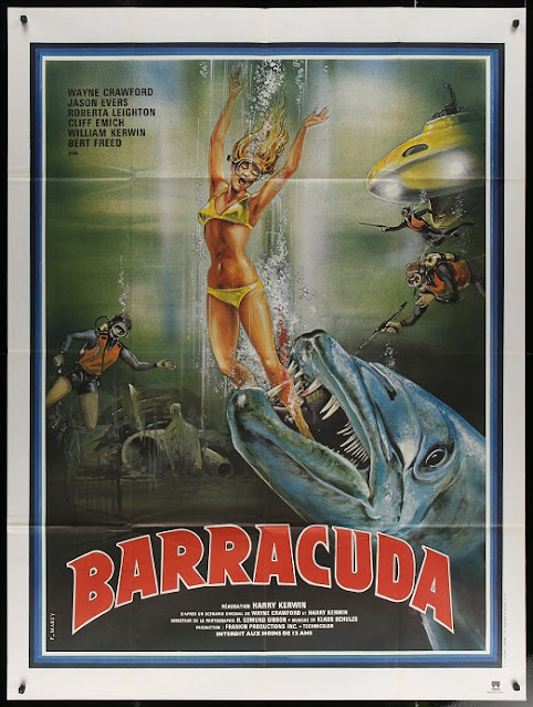 I have one of these already, but I paid a lot more for that one than this one. I love my JAWS knockoffs and there is another grande-sized poster like this on eBay for more than $800! Yikes! So...why not a spare? I never got to see JAWS in its initial release (nor JAWS 2 --but I did see them in their re-releases in the early 80s). BARRACUDA came out in 1978 and it was the first JAWS-like movie I got to see. Sure, the film was NOT great, but at the time, I'd take what I could get.