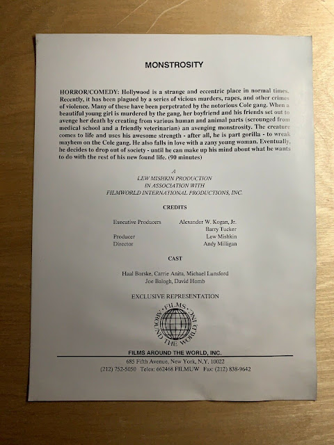 This isn't really a poster, per se. However, this flyer is probably the closest thing this Andy Milligan film ever had to a poster. Made late in his career and premiering straight to video, this 1987 ultra low-rent hodge-podge (literally as well as figuratively) was the third to the last film he made. The reverse features the film's description (in case any investors out there were interested). Milligan was such a schlockster...but as badly made and z-grade as his films were, that didn't stop him from making them and putting them out there. While I wish this were a one sheet, I am happy to have this.