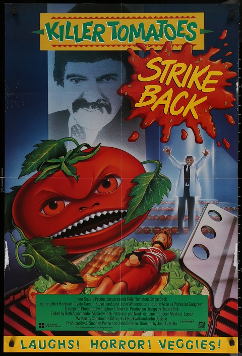 This is the first KILLER TOMATOES sequel---and the video release poster. It did play theatrically (and I do have the poster for that), but I like this video poster better than the theatrical version. I like the play off of RAMBO although no tomatoes grow bodies and become renegade commandos as the poster might suggest. This (and the subsequent sequels) is NOTHING like the original film. I just saw this not too long ago. It was bad (as I remembered). However, a very young George Clooney is one of the stars...and seeing him as a clueless young 80's adult is amusing in an "I can't believe that's George Clooney" kind of way. I had one of these already, but it was ruined in the mail---there's a nasty wrinkle down the left side from top to bottom. This is a replacement.