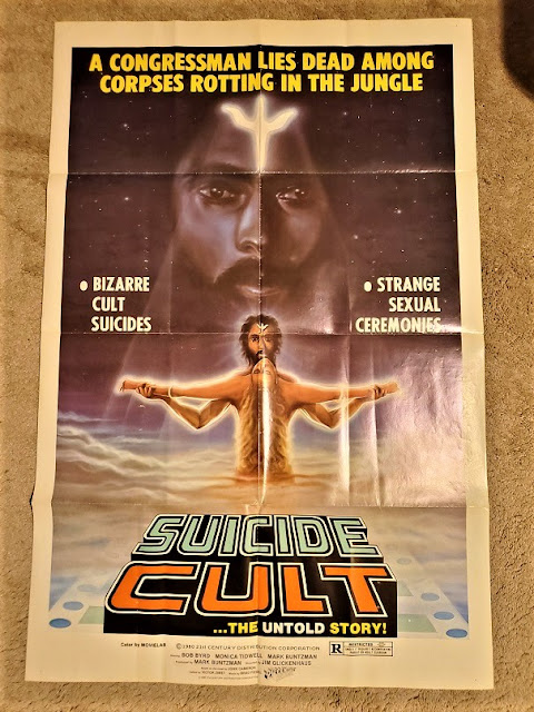 I had tried (unsuccessfully) to score this poster from some of the recent lot auctions on eMovie. Usually, this was the only poster I wanted, so I only half-heartedly tried to score it...and always failed. I hoped that eventually one of the lot buyers would list their purchases on eBay and I could buy myself a copy. Lo' and behold, someone did. I've never seen the flick (had never even heard of it until I saw the poster), but the art I found interesting. It makes me imagine the movie is a cross between ROCK AND ROLL NIGHTMARE (which I've also not seen) and DEATH PROOF. The background skull was, of course, the most attractive thing for me. I didn't even know if it had been released on DVD or BluRay, but found there was a Code Red 2-disc version put out in 2009...that now sells for a minimum of $75. Yowza! The reviews I've found say it's trash--but in a gleefully so-bad-it's-good way. Maybe someone will re-release it. (Are you listening Severin, Vinegar Syndrome, Synapse, etc?)