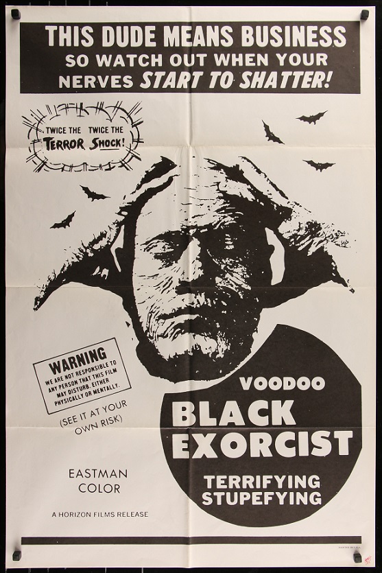I know this is an UGLY poster. It's an even WORSE movie. I've been hunting this movie poster down for YEARS. While I paid more for it than I would have liked to, I have bid higher (and lost) for the poster in the past. What's the deal-i-o? This is actually a Spanish movie from 1975 that has been dubbed and retitled to not only exploit the then-recent hit THE EXORCIST, but also play up the popular horror blaxploitation market of the era. The mummy of a voodoo priest is brought back to life on a cruise ship. It sounds interesting but is total crap and utterly forgettable (scoring a whopping 2.5 stars out of 10 on IMDB.com). But as a collector of schlock and blaxploitation horror posters, I had to have this.
