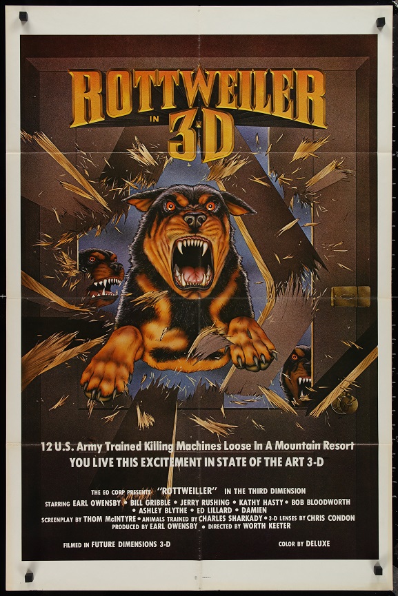 First, ROTTWEILER was one of the 3D films that came out during the gimmick's brief revival in the early 80s. Always a sucker for a gimmick (especially 3D), this made this poster a must-have. The film was made by a filmmaker named Earl Owensby in North Carolina. Most of his films played regionally at drive ins. In the early 80s, he cranked out several 3D features. In addition to ROTTWEILER, I have posters for his 3D flicks HOT HEIR (a seeming play on hot air ballooning), and TALES OF THE THIRD DIMENSION. NONE of Owensby's films ever played in my town--so I never got to see ROTTWEILER or the others (in 3D or even flat!). I have seen something of his called HYPERSPACE (an odd, not-so-funny comic movie featuring a young Paula Poundstone and Chris Elliott) and the bargain basement werewolf shocker WOLFMAN (both on DVD). Based on WOLFMAN (with its claustrophobic and cluttered sets and period costumes), I have long since thought of Owensby as North Carolina's answer to Andy Milligan. I could be (and probably am) all wrong. Whatever. I am just thrilled to finally have a decent ROTTWEILLER. Thank you, eMovie!