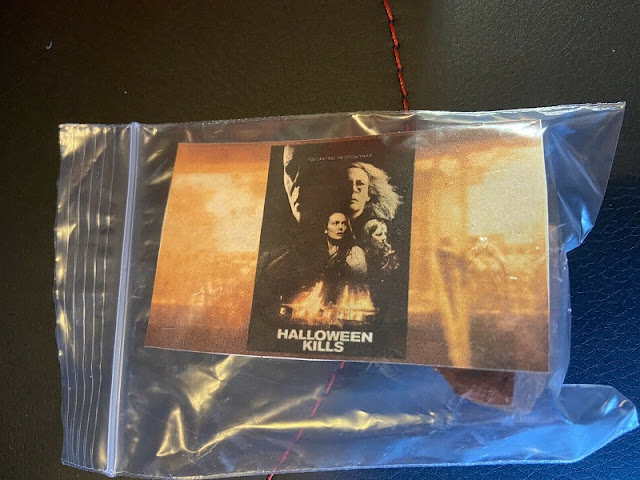 This is questionable (and, I'm aware, it's NOT a poster), but,,, it might also be interesting. This is a piece of a brick that apparently was used in HALLOWEEN KILLS at the set for Haddonfield Memorial Hospital. Having not seen the flick yet, it's impossible to know if it plays into the action...or if some guy on eBay just got a bunch of broken brick pieces and is making a quick buck. Whatever. It wasn't expensive. It's also tiny. The bag fits in my hand.