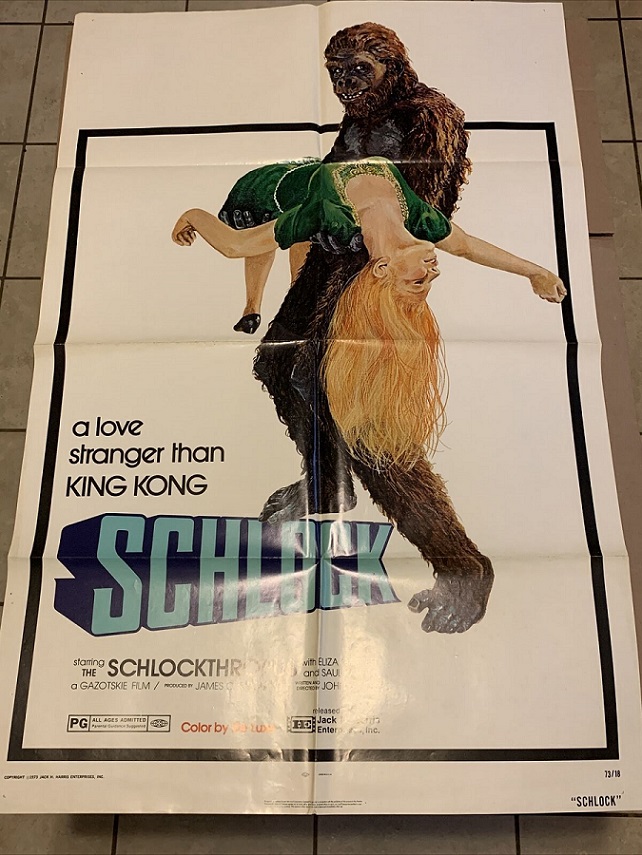 While I am reasonably sure I have one of these (?!?!?), I was not sure. This is John Landis's debut as a director, writer, and actor. This was also one of make-up artist Rick Baker's first credited gigs. Originally filmed and also known as THE BANANA MONSTER, SCHLOCK (not to be confused with Joan Crawford's last flick TROG) is a wacky, low-budgeter that is an obvious calling card for Landis to get the KENTUCKY FRIED MOVIE gig next (and for Baker to get the 1976 KING KONG remake)! Starring the Schlockthropus!!! (Actually, Landis starred as the big, hairy one.) Baker has an uncredited small role as does producer Jack H. Harris (producer behind THE 4D MAN, DINOSAURUS!, EQUINOX, DARK STAR, THE EYES OF LAURA MARS, and all three of THE BLOB films). Famous Monsters' editor Forrest J. Ackerman also has a cameo. This is the original release, full-color one sheet. (The 1977 rerelease uses the same image, but is not in color.)