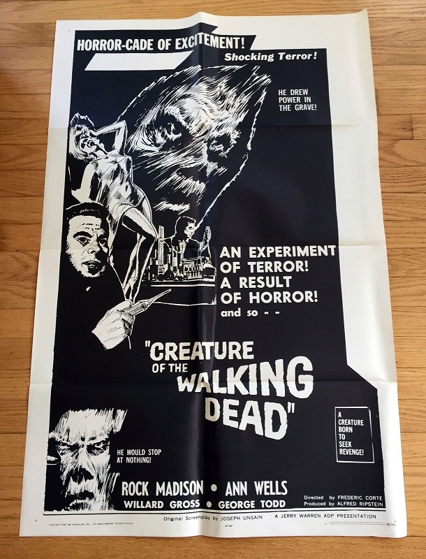 I actually have a copy of this poster hanging in my kitchen. I don't know what I was thinking buying another. Perhaps I'm hoping for an upgrade? I've seen a lot of the old zombie movies, but can't seem to track down VALLEY OF THE ZOMBIES. CATMAN OF PARIS is equally elusive. (I bought THE LEOPARD MAN once, and oops! Obviously the WRONG film. Ha!) Someday I may track them down... Fun, old, re-release combo poster from 1956, though.