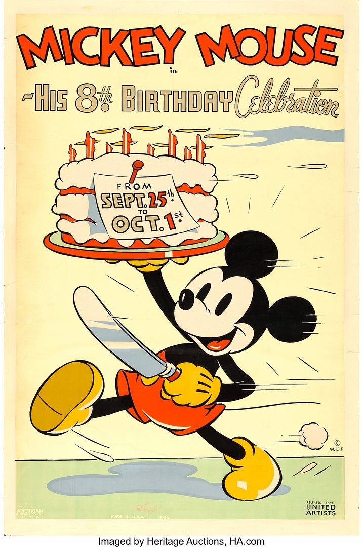 Special 40" X 60" silkscreen posters were produced by Walt Disney throughout the mid-1930s to advertise his cartoons and characters though very few have survived. This is the only known copy of the large format poster to advertise Mickey Mouse's 8th birthday. The theater that would display this poster would typically run a series of the famous mouse's cartoons to commemorate the event.