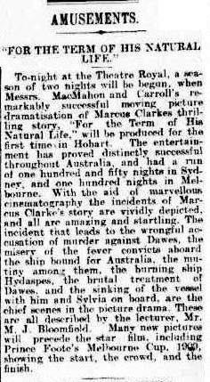 For The Term Of His Natural Life premiered in Adelaide S.A. on 27 June 1908. The film Is credited on some websites as commencing screening in Australia on 8 August 1908, This is incorrect as the 8 August date is for later on in the year screenings in Sydney.