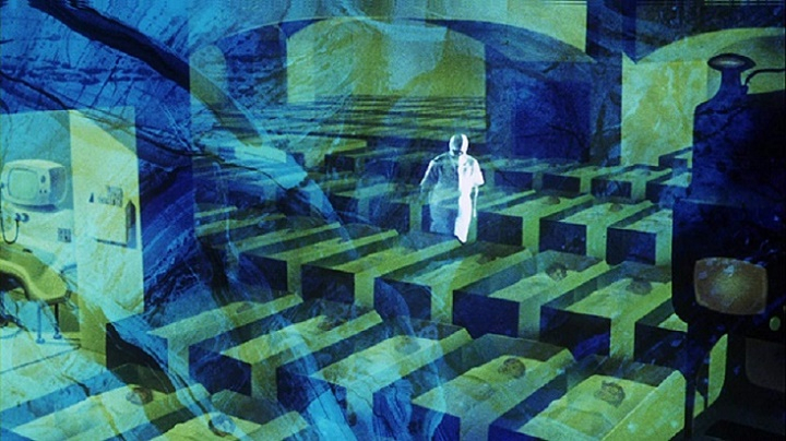 Good thinking, but it isn't The Terminal Man from 1974. Concentrate on the previous decade's sci-fi films.