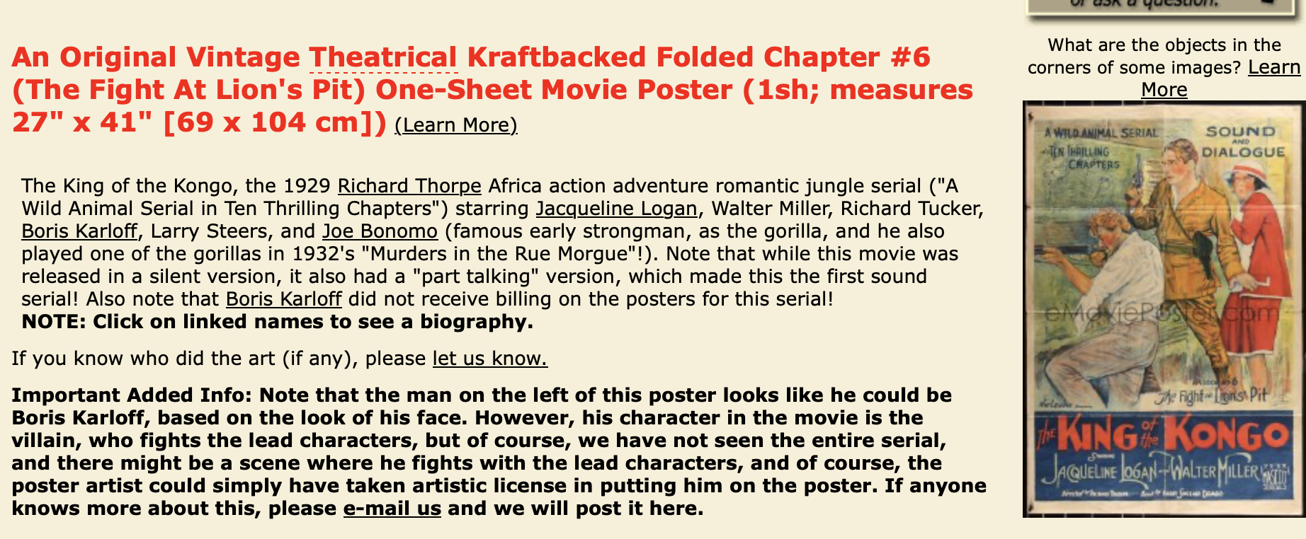 Now, not a question for Bruce, but an answer about who this is on the poster. It's not Boris Karloff as speculated but is actually Richard Neil who plays the prisoner. He doesn't get released from his cell until Chapter 9 so the artwork for Chapter 6 is a bit premature. There also isn't a scene exactly like this in the serial.