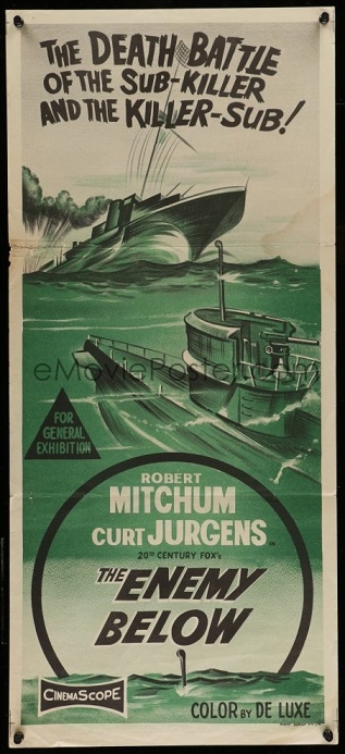 The Enemy Below ( 1957 ). I believe this may be an alternative printing for the first release of The Enemy Below in Australia in January, 1958. There may also be a full colour version of this duotone daybill design. Has anyone ever sighted an image of a full colour daybill ? 0