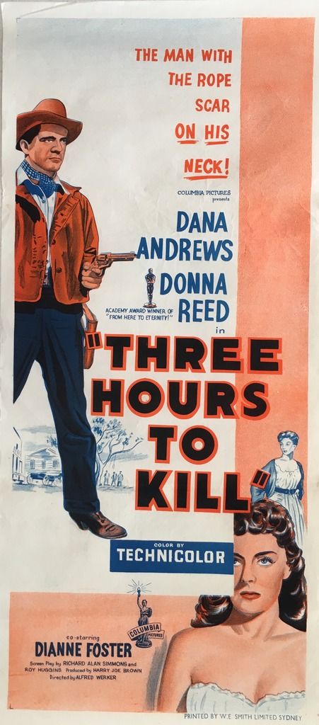 Perfect . The Three Hours To Kill daybill I have never been keen on as it partly obscures Donna Reed's lovely face. The W.E.Smith artist copied from the U.S. 3 sheet which is the same. Had they copied from the U.S. insert it would have been perfect as Donna's face isn't obscured at all on the insert.