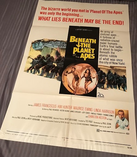 This was the second APES poster I owned (after CONQUEST OF THE PLANET OF THE APES which I'd scored as a teenager). Notice the apparent discoloration on the lower right side? That was because the eBay seller wasn't very careful when he packed this up---and got some of the sticky glue/tape stuff on those USPS Priority Mail boxes on the poster. (No, the poster was NOT wrapped in plastic or anything else protective. Just shoved in a box, sealed, and sent. I had to painstakingly super slowly peel it away, That discoloration is a thin layer of the box still attached to the back of the poster. GRRR. I have purchased another copy or two since getting this one. But this remains my least favorite film in the series as well as my least favorite poster.
