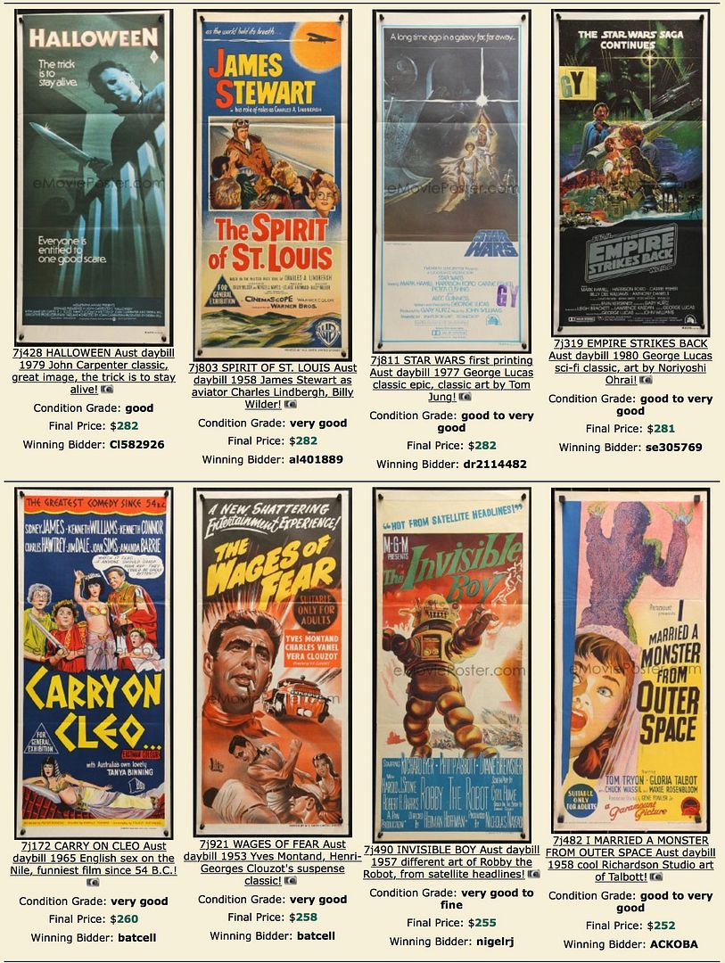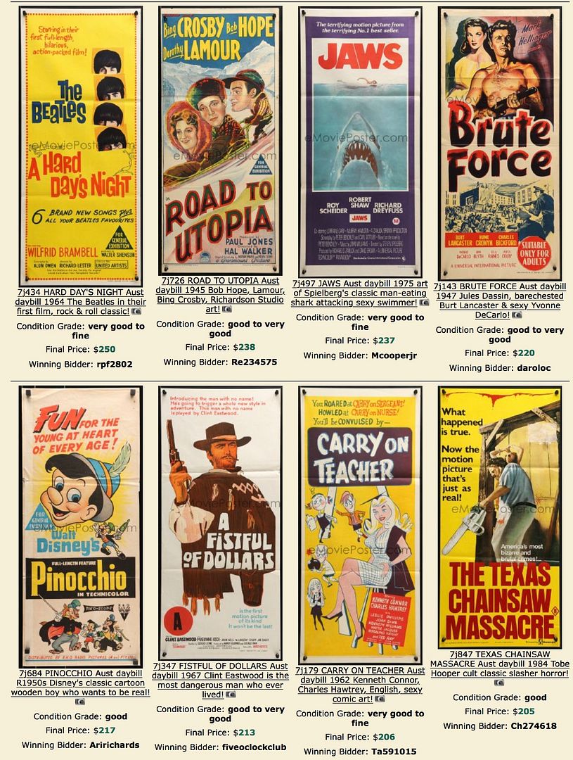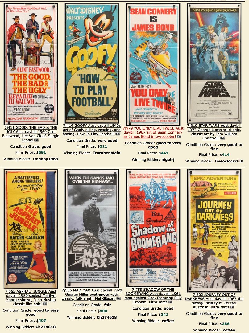 I will say that while the most active Australian collectors (many of whom are on this forum) DO take part in our auctions of Australian posters, we also DO have several bidders who are surely unknown to everyone here! And I will also add that our next auction of Australian posters is set for August 31st, and as of right now I don't have enough daybills to fill that auction, so if anyone here has seen our results and would like to send some to us for that auction, they need to do so ASAP!