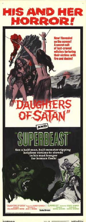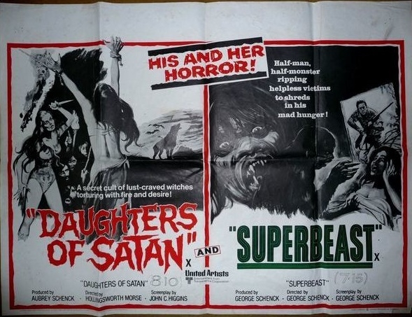 The following are three countries printed posters for the double bill programme of Daughters Of Satan (1972) and Superbeast (1972).