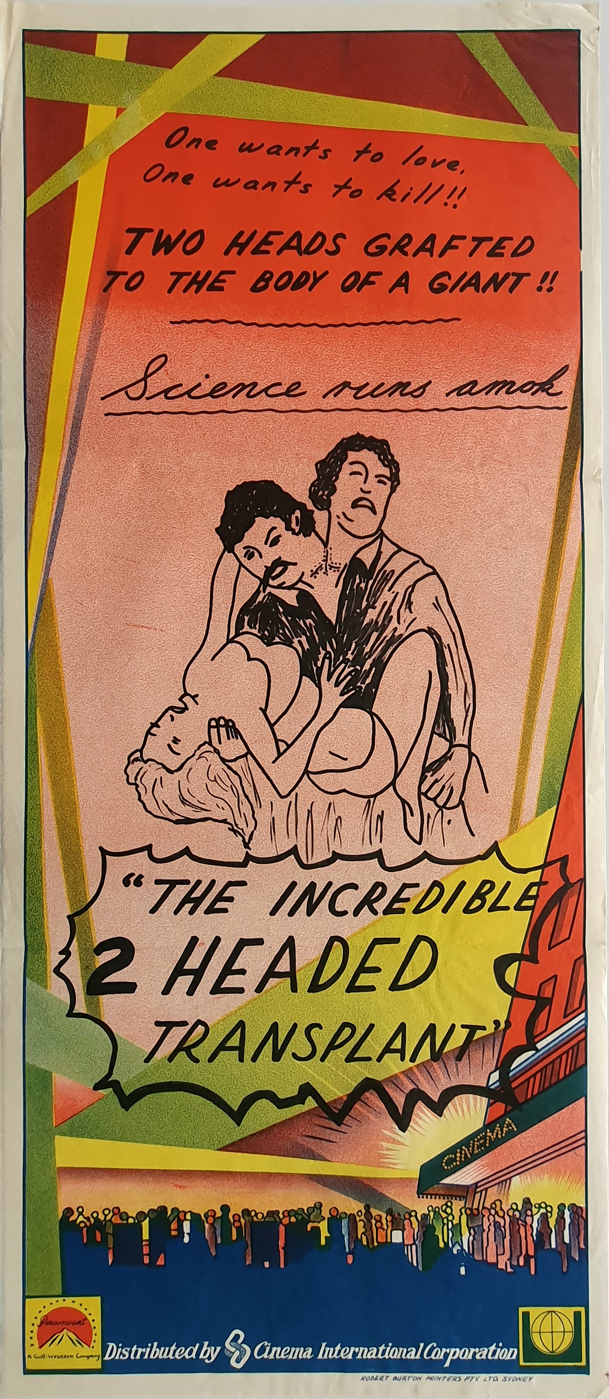 The following Australian printed The Amazing 2 headed Transplant (1971) daybill, minus the Roadshow Distributors credit also fails to impress.
