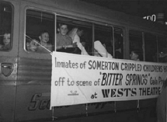 Children from the Somerton Crippled Childrens home on a Pioneer Tour coach that was conveying them to the premiere screening.