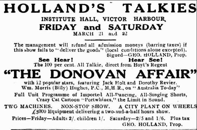 The following article and theatre advertisements  were taken from various 1929 and 1930 issues of Trove and details some information on Holland's Talkies operations .