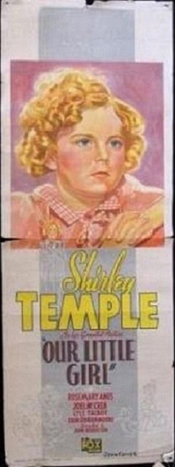 Two styles of Our Little Girl ( 1935 ) daybill. Both posters are fox Films released just prior to the merger. The newly displayed image appearing on the right features Shirley Temple's image only. Images of her co-stars Rosemary Ames and Joel McCrea are absent from this version..