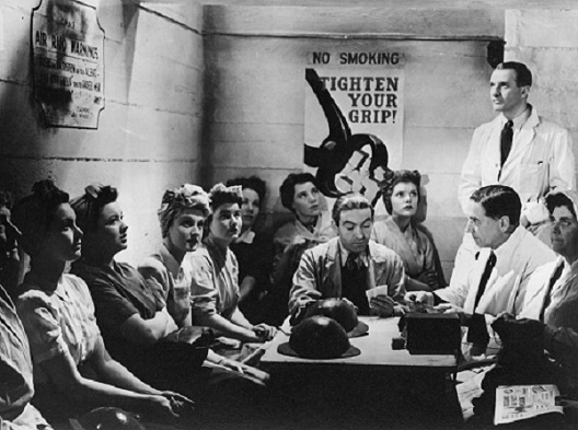 195: the actress second left looks like Kay Walsh who I believe played John Mills' girlfriend in 'In Which We Serve' could this be from a flashback scene? Although I think she experiences an air raid in a house and not as the image appears as a shelter.