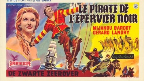 There was an Italian and French co-production originally released under the title of Il Pirata Dello Sparviero Nero in 1958. The film starred Mijanou Bardot the younger little known sister of Brigitte Bardot. When the film was released in the U.S.A. in 1961 under the Englidh title of The Pirate Of The Black Hawk by Roger Corman's The Filmgroup some devious advertising was used on the following one sheet. BARDOT in bold lettering and an image of Brigitte Bardot appearing in the centre of the poster. Towards the bottom of the poster the credit of starring Mijanou BARDOT does appear though..